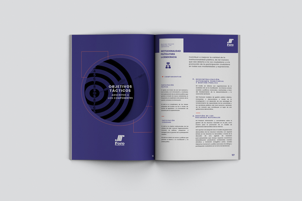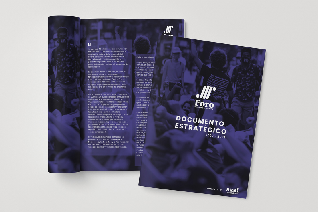 Diseño editorial para la presentación del plan estratégico 2022 – 2031 participación democrática Foro Nacional por Colombia.