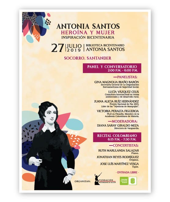 En el marco del Bicentenario de la Independencia de Colombia, La Fundación Socorranos en Acción con el apoyo de la Universidad Industrial de Santander UIS, lanzan el evento «Antonia Santos: Heroína y Mujer», para conmemorar a la heroína comunera mediante un panel académico llevado a cabo por mujeres que actualmente lideran grandes escenarios en Colombia y el mundo. Como agencia participamos desde la planeación estratégica del evento, la comunicación, el diseño de formatos, y el acompañamiento de difusión durante el evento, cuyo eje temático se enfocó en la construcción de un nuevo modelo participativo y protagónico para la mujer en el escenario contemporáneo mundial y, muy particularmente, el nacional del post conflicto.